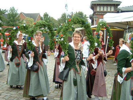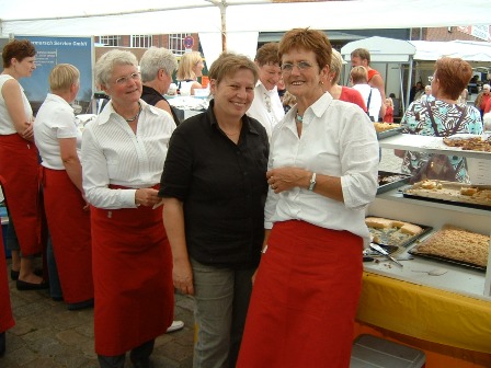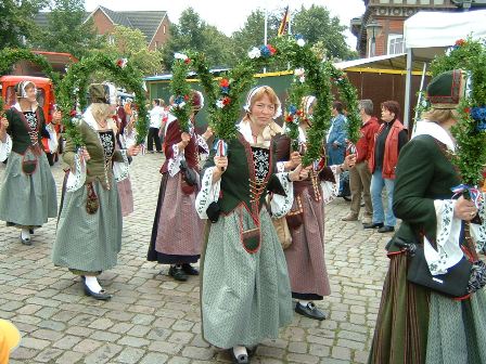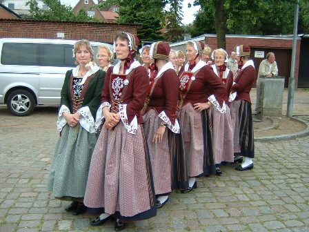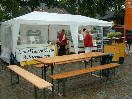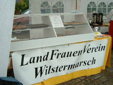 Stadtjubiläum war am 01.07.2007 der Tag der Vereine. Die Veranstaltung begann mit einem Kommers, zu dem auch die 3 Vorsitzenden des Landfrauenverein Wilstermarsch eingeladen waren. Im Anschluss daran folgte der Umzug aller teilnehmenden Vereine durch die Stadt. Gegen 14 Uhr traf der Zug auf dem Colosseumplatz ein. Die Vereine präsentierten sich dort an vielen bunten Ständen und luden die Gäste zum Mitmachen ein. Unser Landfrauenverein hatte einen Platz am Rande der Bühne zugewiesen bekommen. In einem Zelt, das die Landfrauen vor dem unsteten Wetter schützen sollte, war ein emsiges Treiben zu beobachten. Der Verkauf von Kaffee, Tee, Holunderblütenbowle, selbstgebackenen Kuchen und leckeren Käsespießen hielt die fleißigen Damen in Atem. Abwechslungsreich wie das Wetter war auch der Kundenzulauf. Nach mehreren kräftigen Regenschauern am späten Nachmittag hatte Petrus es endlich geschafft gegen 19.30 Uhr auch den letzten Besucher des Festes vom Colosseumplatz zu fegen. Die Trachtentänzerinnen ließen sich bei ihrem ersten Auftritt von einem nahenden Regenschauer nicht irritieren und brachten ihre Darbietungen trotz erster großer Regentropfen mit Bravour zum Abschluss. Die Veranstaltung endete mit einem letzten Auftritt der Trachtentanzgruppe (in Begleitung der Wolke vom 1. Auftritt) und auch mit dem im Regen gesungenen Schleswig-Holstein Lied konnte der von Amtsvorsteher Eggert Block erwähnte Wettergott nicht besänftigt werden. (tt) |