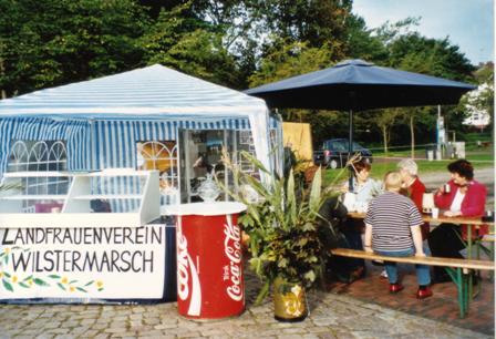 | Im Jahre 2006 war der Landfrauenverein Wilstermarsch erstmalig auf dem Bauernmarkt in Wilster mit einem Stand vertreten. Die Landfrauen hatten Schmalz- und Käsebrote, Trinkmolken, Kaffee, sowie Kürbis-Melonen-Bowle im Angebot. Obwohl am Mittag Dauerregen einsetzte, war der Markt noch ganz gut besucht. |