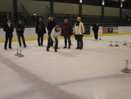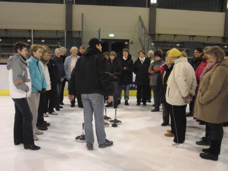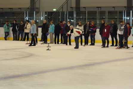 Über siebzig Landfrauen trafen sich in der EIS-Sporthalle in Brokdorf und ließen sich von Eismeister Enrico Arndt ins Eisstockschießen einweisen. Geduldig erklärte er die vereinfachten Regeln des Sports, die Wertung und gab Tipps zu dem Verhalten auf dem Eis. Es galt, auf dem zirka drei mal 28 Meter großem Feld mit jeweils acht Spielern den eigenen Eisstock so nah wie möglich an die auf der gegenüberliegende Seite positionierten Daube zu bringen. „Das ist eine Mischung aus Kegeln (vom Bewegungsablauf her) und Boccia (vereinfachte Regeln), nicht zu verwechseln mit Curling. Zwei Stunden bevölkerte der Landfrauenverein Wilstermarsch die Eisfläche und hatte viel Spaß. „Man muss sich erst mit den verschiedenen Geschwindigkeiten der unterschiedlichen Laufsohlen zurechtfinden“, so das Fazit der Übungsstunde.(sko) ....... und los gehts!
