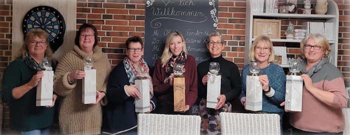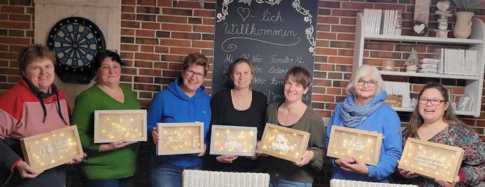 in Gribbohm. Eine Gruppe fertigte einen Kerzenständer mit einem "schwebenden" Licht, die andere Gruppe bastelte einen Bilderrahmen mit Hintergrundbeleuchtung und verschiedenen Motiven. Wir wurden von Ina Rave sehr herzlich mit einem Begrüßungs-Sekt empfangen, die einzelnen Arbeitsplätze waren schon für uns vorbereitet und dann konnte das Basteln unter Anleitung losgehen. Schritt für Schritt wurden die einzelnen Arbeitsgänge gezeigt und erklärt und ggf. tatkräftig von Ina unterstützt. Dauerte es noch ein bisschen die richtige Schablone zu finden, ging der Rest locker von der Hand. Am Ende hatte jeder ein sehr schönes Einzelstück gefertigt und war mit seinem Kreativen Ergebnis sehr zufrieden (Fotos und Text de). |