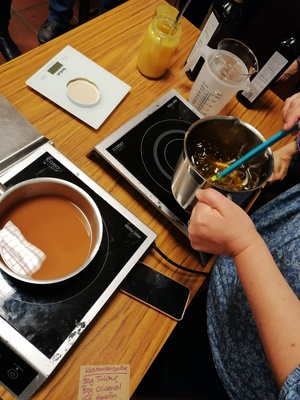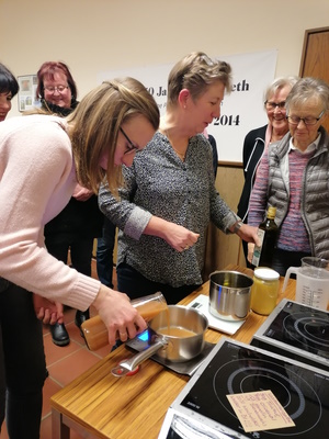 Körper und die Seele beeinflussen können. Frau Maxl gab einen Einblick in die verschiedenen Verfahren zur Gewinnung der ätherischen Essenzen und tat dies sehr alltagsbezogen an Beispielen, die man im heimischen Garten oder in der Natur beim Spazierengehen findet. So lindern z.B. der Breit- und Spitzwegerich den Juckreiz bei Insektenstichen, Lavendelöl schafft Hilfe bei Verbrennungen, Zitronenmelisse wirkt beruhigend bei Migräne und Herpesinfektionen, Thymian hat eine schleimlösende Wirkung und findet sich deshalb häufig in Hustensaft und -bonbons wieder. Majoran wirkt antibakteriell und fand deshalb schon früher z.B. zur Haltbarmachung bei der Wurstherstellung seine Anwendung. Des Weiteren hinterlassen Ätherische Öle im Gegensatz zu den fetten Ölen keine Flecken auf Textilien, was darauf zurückzuführen ist, dass sie vollständig verdunsten. Daher finden sie ihre Verwendung auch in der Parfümherstellung. Im Anschluss wurden in zwei Gruppen verschiedene Öle und Salben hergestellt. Die Herstellung der Kastaniensalbe brachte alle Teilnehmerinnen zum Schwitzen. Die Zutaten Kastanientinktur sowie Olivenöl, Lanolin, Bienenwachs und Wacholder wurden in zwei Töpfen leicht erwärmt und in ein Schraubglas gefüllt. Damit sich die Zutaten miteinander verbinden, musste hier schnell und lange gerührt werden. Die Kastanie wirkt unter anderem gefäßstärkend, blutgerinnungshemmend und entzündungshemmend, deshalb eignet sie sich hervorragend zur Herstellung von Salben gegen Muskel- und Ischiasschmerzen, sowie Venenleiden. Während dessen stellte die zweite Gruppe Gute Laune Öl, Massageöl und Erkältungsbadzusatz her. Es war ein interessanter Abend, der allen Teilnehmerinnen viel Spaß gemacht hat (Fotos und Text Sabine Saß). |