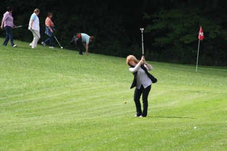 Der Landfrauenverein Wilstermarsch übte sich im Rasensport besonderer Art. Mit 25 Frauen fuhr der Verein nach Itzehoe, um auf Hof Basten Swingolf auszuprobieren. Hans-Wilhelm und Ellen Ehlers betreiben den landwirtschaftlichen Betrieb in siebter Generation und haben im vergangenen Jahr eine 9-Bahn Swingolfanlage eröffnet. Das Besondere an diesem Sport ist, dass der Spaß im Vordergrund steht und nicht die sonst übliche Golf-Etikette herrscht. „Hier geht es etwas lockerer zu“, erklärte Axel Bodenstein. Er gab den Landfrauen eine Einweisung, denn ganz ohne Regeln geht es auch hier nicht zu. Die Schläger haben drei Schlagseiten, wo bei eine abgeflachte zum Einputten geeignet ist. „Das kommt aber auf die Entfernung zum Loch und der Schlagvorliebe des Spielers an“, kommentierte Bodenstein. Auf dem zirka fünf Hektar großen Gelände sind neun Bahnen mit verschiedenen Längen und Schwierigkeitsgraden hergerichtet. Der naturbelassene Platz wird nur gemäht und hat durch regelmäßige Pflege und Nachsaat eine feste, gut bespielbare Grasnarbe. Die Bahnen setzen sich durch eine kürzere Mähung von der übrigen Fläche, dem Rough, ab. Der „Kaninchenhügel“ zeichnet sich durch sanfte Anhöhen aus, über die sich die siebzig bis 300 Meter langen Bahnen ziehen. Eine Matte und ein Kunststoffstift (Tee) erleichtern den Abschlag. Ziel ist, den Ball mit so wenigen Schlägen wie möglich in ein Loch mit zirka 30 Zentimetern Durchmesser zu bringen. „Das hat viel Spaß gebracht“, war die einhellige Meinung der Landfrauen-Teilnehmerinnen.(sko) |