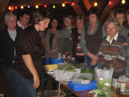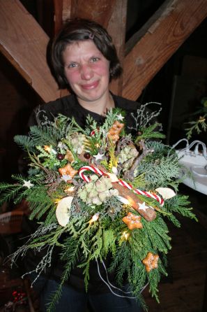 Passend zur bevorstehenden Weihnachtsfeier am 10. Dezeber im Landgasthof „Zum Dückerstieg“ informierte sich der Landfrauenverein der Wilstermarsch über festliche Dekorationen. Maike Rave aus Grevenkop zeigte in der Rumflether Mühle, wie man mit wenig Grün und interessanten Accessoires hübsche Gestecke für die Adventszeit anfertigen kann. Die Floristin arbeitet seit achtzehn Jahren in ihrem Job und gab Tipps zum Stecken und Binden. Maike Rave steckte auf nassem Moosi zuerst eine Lichterkette mit Krampen fest, um dann die verschiedenen Zweige von unter anderem Thuja und Tanne so zu stecken, dass das Stromkabel nicht mehr zu sehen und noch Platz für Extras wie Kugeln, Nüsse und Zapfen oder Schleifen war. Das Binden von Schleifen konnten die Landfrauen an verschieden Bändern üben, während Maike Rave einen exklusiven Weihnachtsstrauß, ebenfalls mit Beleuchtung, band. Sie zeigte das Halten beim Binden und verdrahtete Zimtstangen, Wurzelwerk und Hortensienblüten. Mit Zuckerstangen und Keksen aus Kunststoff ein absoluter Hingucker.(sko)